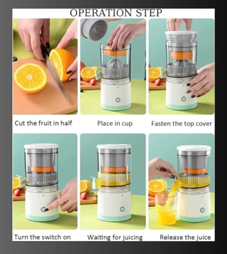 - 𝗦𝗔𝗙𝗘 𝗧𝗢 𝗨𝗦𝗘: All of our orange juicer electric Parts are Made of High-Quality ABS+AS Material, Which is Safe and Non-Toxic. Gives You and Your lovers flavourful Juice Every Day! Warmly Remind You that Please cut the Fruit in Half or Smaller in Advance to Prevent the Fruit from Getting Stuck. No Need to Plug in During Use. Use it After being Fully Charged and don't use it While Charging. It Takes 1.5-2 hours to Charge.