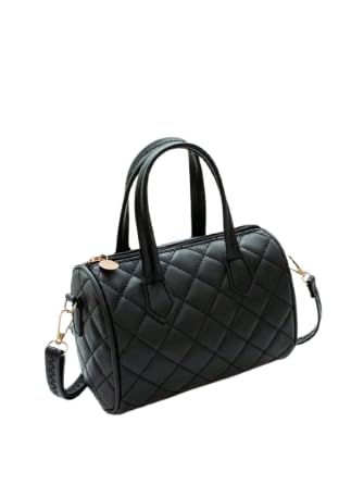 Generic - Quilted Barrel Handbag with Double Handles, Crossbody Strap, Black Faux Leather
