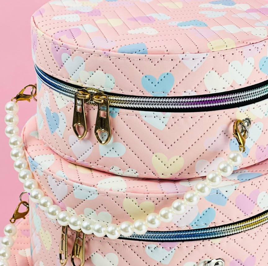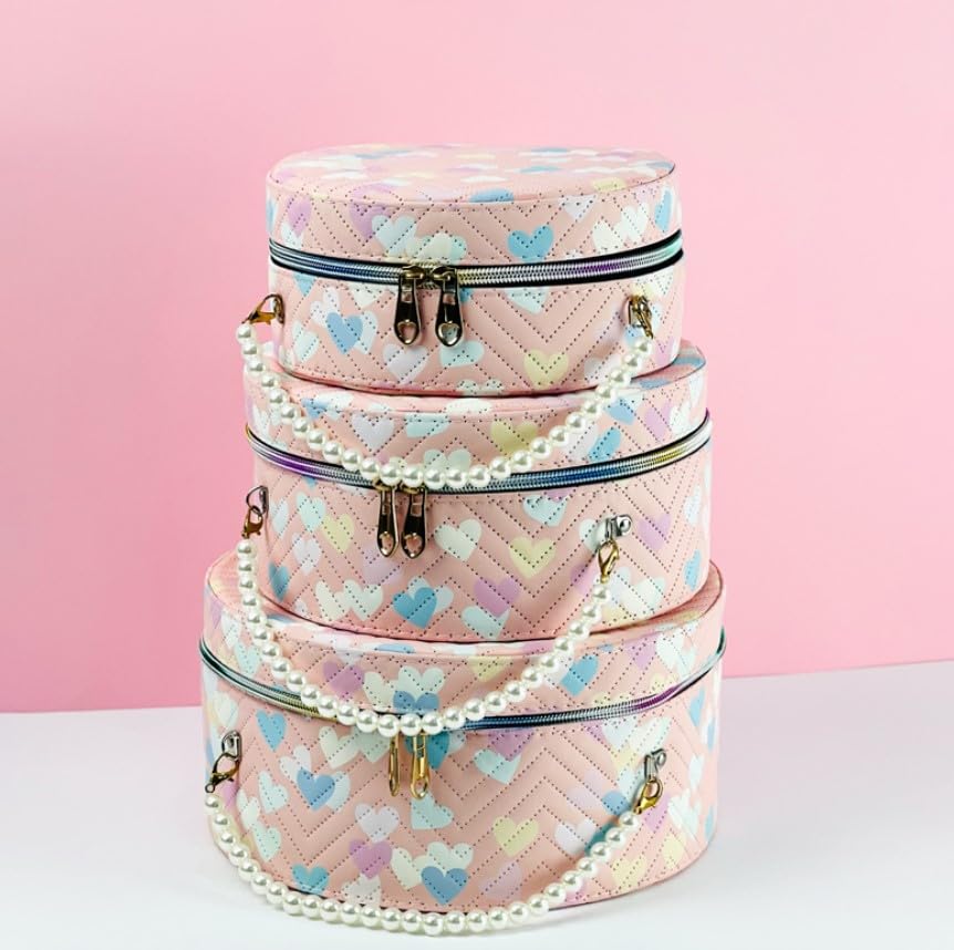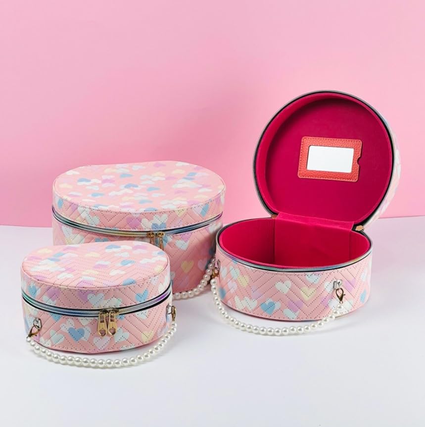 Generic - Quilted Heart Pattern Jewellery Storage Boxes Set of 3, Pink with Pearl Handle, Round Travel Cases with Zipper