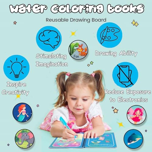 QXNDXQ - كتاب تلوين مائي سحري للأطفال من كيو اكس ان دي اكس كيو، عبوة من 4 كتب رسم مائي وتلوين سحرية قابلة لإعادة الاستخدام مزودة ب 4 أقلام مائية للأطفال من عمر 3 سنوات، نمط 2