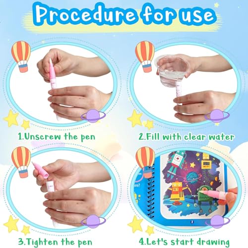 - سهل الاستخدام: ما عليك سوى إضافة الماء إلى القلم ثم الطلاء على كتاب الألوان المائية. يمكنك رؤية الألوان والصور المخفية. بعد وقت انتظار من 5 إلى 10 دقائق، تختفي هذه الدهانات والصور بشكل طبيعي، لذلك يمكنك استخدام كتب الرسم بالألوان المائية هذه مرارًا وتكرارًا.