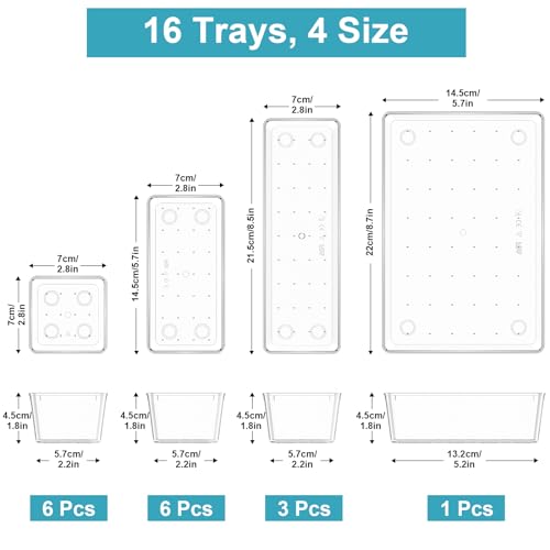 Radikor - منظِّم أدراج، طقم من 16 قطعة، بأربعة أحجام، من البلاستيك الشفاف، قابل للتكديس، لتقسيم الأدراج في الحمام والمطبخ ومستحضرات التجميل من راديكور