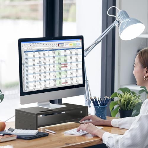 - 【Phone Card Slot & 2-Tier Storage & Great Desktop Organizer】 Computer stand’s unique built-in phone slot to keep your phone close at hand, saving valuable desk space. Monitor stand for desktop with 2 storage shelves, providing enough space to store pen,books, keyboard, mouse, calculator, paper files,small office items, etc., keeping your workspace tidy