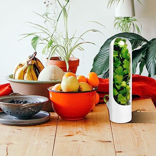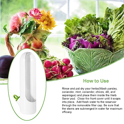 - 【Refillable reservoir with removable cap】: Rinse and pat dry your herbs( cilantro, mint, chives, rosemary, oregano, thyme, or asparagus) and place them inside the Herb Saver pod. Close the front cover until it snaps into place. Add fresh water to the reservoir through the removable filler cap. Be sure that the stems are submerged in water for maximum efficacy.