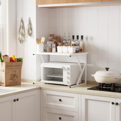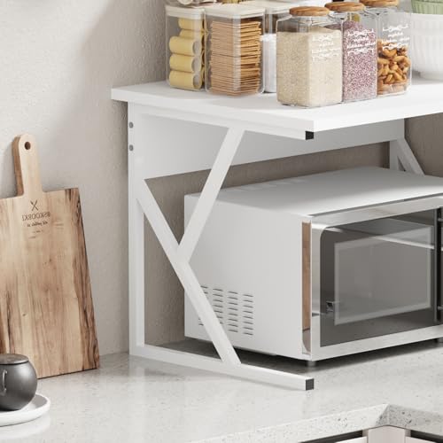 Rainbow Tree - رف فرن ميكروويف من طبقتين من رينبو تري، مع رف للمطبخ، حامل تحميص ميكروويف شديد التحمل، منظم سطح المطبخ، رف خبز خشبي للمطبخ مع اطار معدني لون أبيض