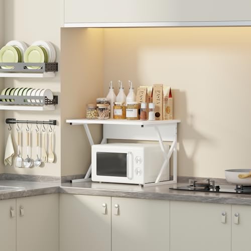 - 【رف خبز شديد التحمل】 مصنوع من لوح خشب ليفي متوسط الكثافة متين، مدعوم بإطار معدني، يمكن لرف الميكروويف هذا للمطابخ حمل وزن يصل إلى 30 كجم. يمكنك وضع الكثير من العناصر عليها مثل الميكروويف أو محمصة الخبز أو أواني المائدة أو الزجاجات أو التوابل أو البهارات أو الأطعمة المعلبة أو الأطباق أو القدور أو المقالي أو أي أدوات مطبخ أخرى.