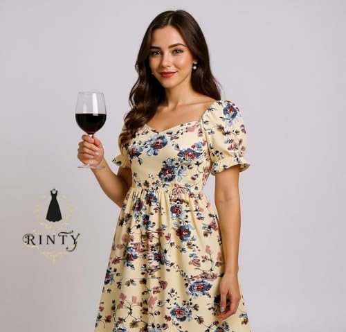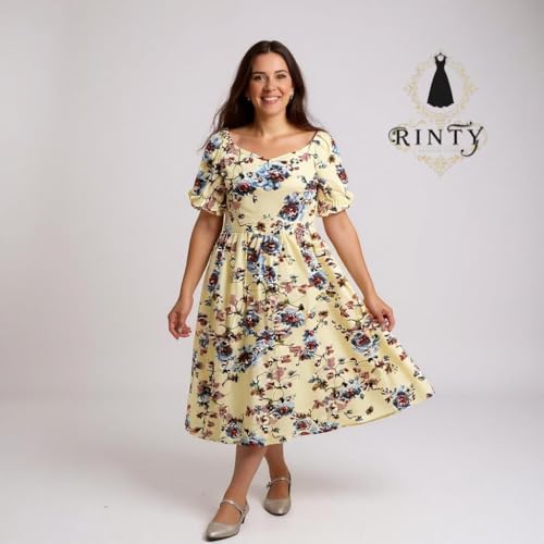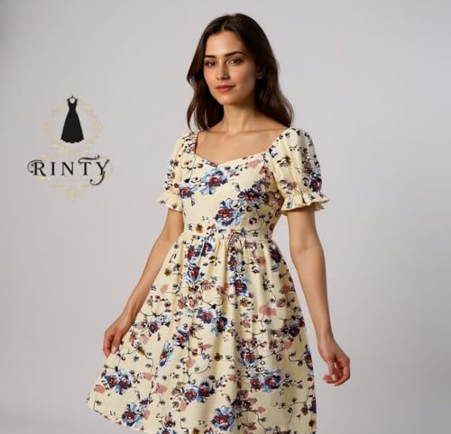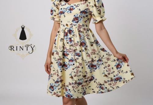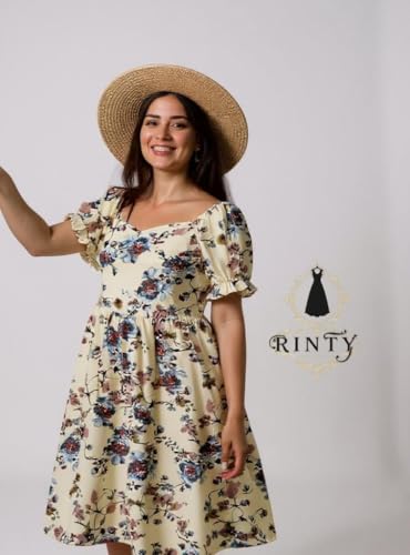 Generic - Raintie Classic Summer Dress, Cream with Blue and Orange Floral Pattern, Short Puff Sleeve, Small