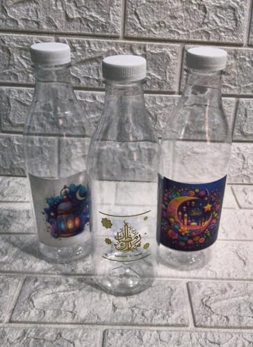- زجاجات زخرفية: تتميز كل زجاجة بملصقات جميلة بطابع رمضان مع تصميمات هلال وقمر ومسجد وفانوس تضيف سحرًا احتفاليًا إلى طاولة الطعام الخاصة بك
