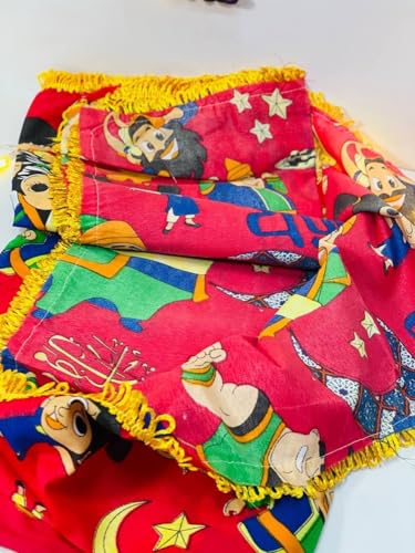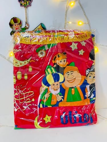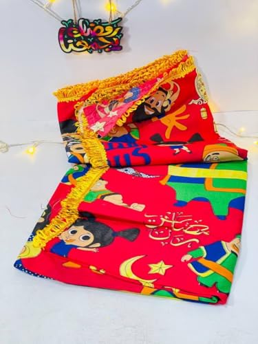 - تصميم احتفالي مميز: مفرش رمضاني بخلفية حمراء زاهية مزين برسومات كرتونية ملونة لشخصيات تقليدية وفوانيس وأهلة ونجوم تضفي أجواء رمضانية بهيجة.
