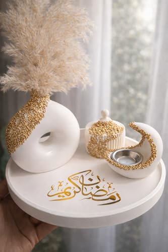 - Unique Modern Design: the set includes a fashion Donut vase, elegant incense holder, and a luxurious bowknot with ramadan kareem embellish in gold Arabic calligraphy on the base