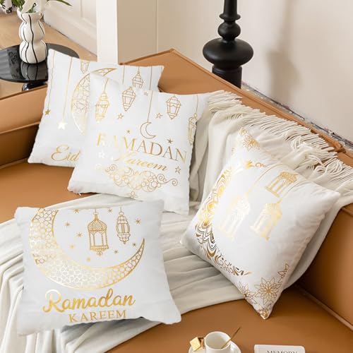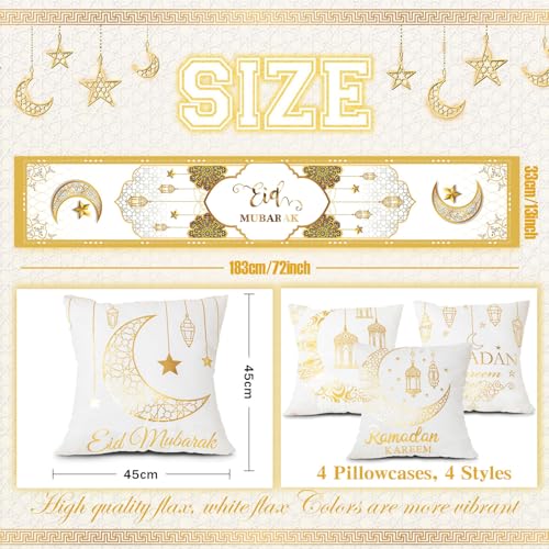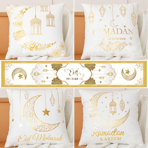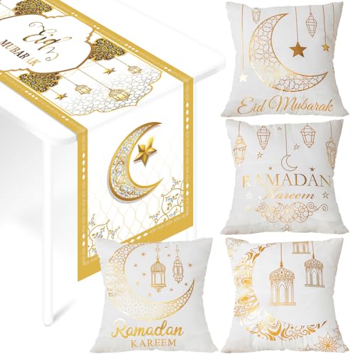 Hystyfu - مجموعة اغطية وسائد زينة رمضان - 5 قطع من مفرش طاولة كتان من الرقائق المعدنية الذهبية مع 4 اغطية وسائد مخملية قصيرة، ديكور منزلي انيق لشهر رمضان والعيد والمناسبات الخاصة - جاهز كهدية