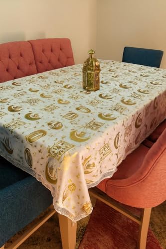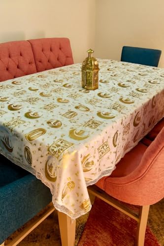 - تصميم رمضاني فاخر: مفرش طاولة أنيق باللون الأبيض والذهبي مزين بزخارف إسلامية تقليدية تشمل الهلال والنجوم وعبارات رمضان المباركة لإضفاء أجواء احتفالية مميزة
