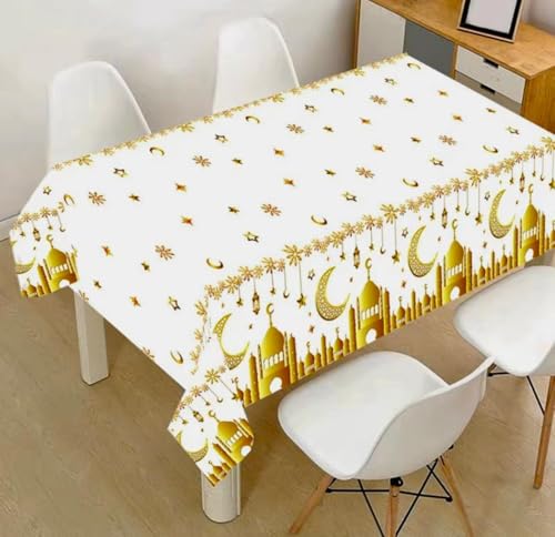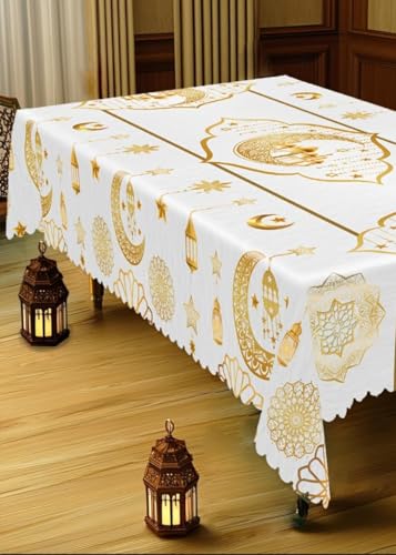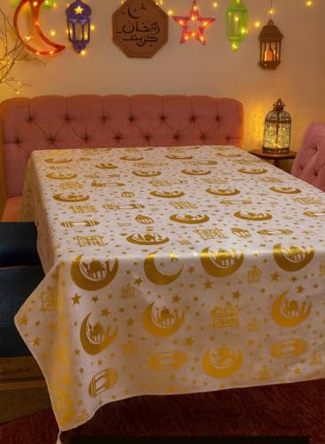 Generic - مفرش طاولة رمضان من القماش ، أبيض وذهبي، زخارف إسلامية، هلال ونجوم، 300x150 سم