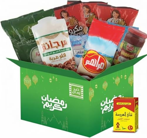 - ١٠ كيلو رز ٣ كيلو سكر ٣ كيلو دقيق ٣ كيلو مكرونة سمنه ١.٥ كيلو زجاجة زيت ٢ كيلو بلح كيلو فول ملح ٧٠٠ شاي ٢٥٠ جم