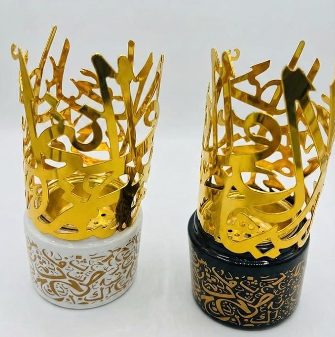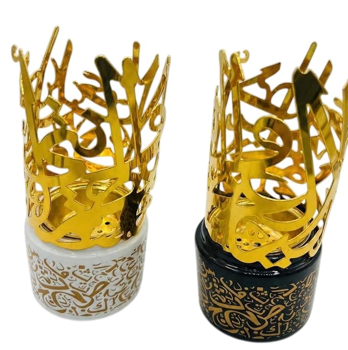 - القاعدة: سيراميك عالي الجودة ومقاوم للحرارة، متوفر بلونين (أبيض لؤلؤي / أسود ملكي) ومزين بطباعة ذهبية لنقوش عربية.