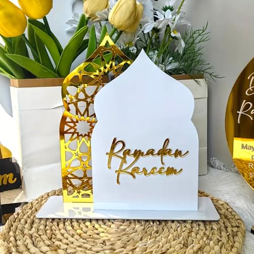 Generic - Ramadan Kareem Decorative Painting, Mosque Design with Islamic Motifs, White and Gold, 20x20cm, Eid Home Decor