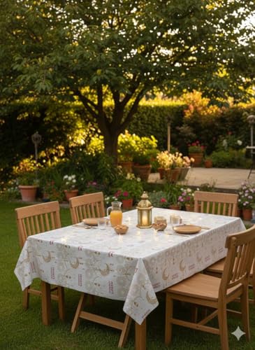 Generic - Ramadan Kareem Heavy Plastic Tablecloth, White and Gold, Islamic Crescent and Star Motifs