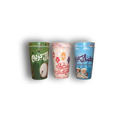 - تصميم احتفالي لشهر رمضان: مجموعة من 6 أكواب بلاستيكية تتميز بأنماط إسلامية متنوعة جميلة وموضوعات رمضان كريم بألوان حمراء وأزرق وأخضر نابضة بالحياة مثالية للاحتفال بالشهر الكريم