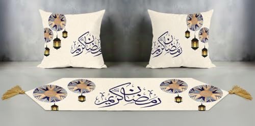 - COMPLETE Ramadan Decor Kit: includes 2 pillows and table runner with coordinating designs that combine the original Arabic Calligraphy and traditional lanterns to create a distinctive ambience to your home