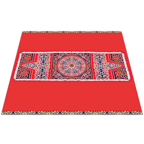 Generic - مفرش ترابيزة بتصميم خيامي لرمضان مصنوع من مزيج القطن مع طرف مزين بلون احمر مقاس - 150*150 متر شكل مربع