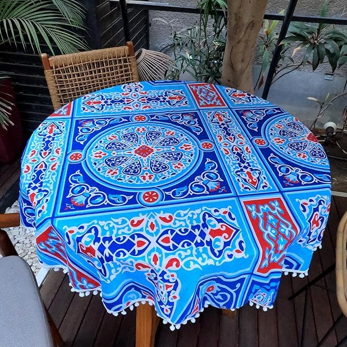 Generic - مفرش طاولة بتصميم خيامية بشراشيب حول الحواف - دائري 140 سم (ازرق فاتح)