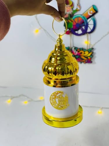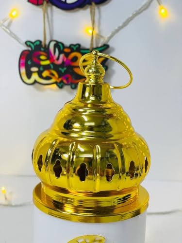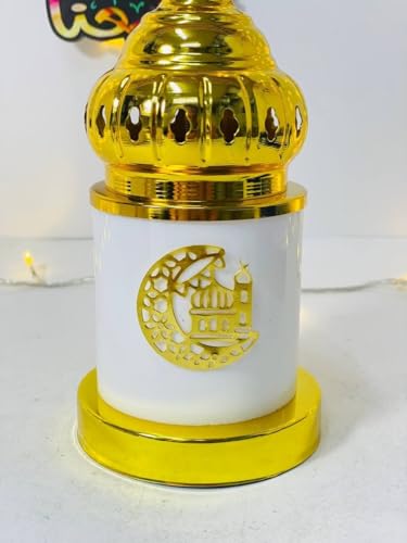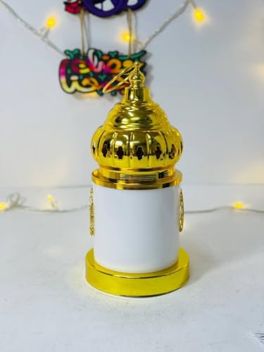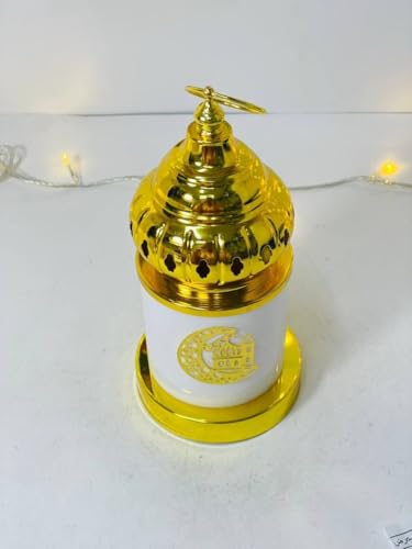- Stylish Traditional Design: Classic design Ramadan lantern with decorative gold dome and white base holding Islamic decoration for crescent and mosque