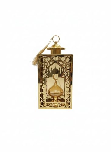 - تصميم فاخر: فانوس رمضاني مصنوع من المعدن الذهبي مع نقوش إسلامية متقنة تجمع بين المسجد والهلال في تصميم أنيق