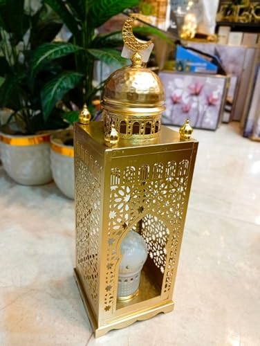 - Luxury Islamic Design: Ramadan gold lantern decorated with intricate Islamic motifs and traditional geometric patterns with the moon on on the top, add spiritual and aesthetic touch to the Ramadan decoration