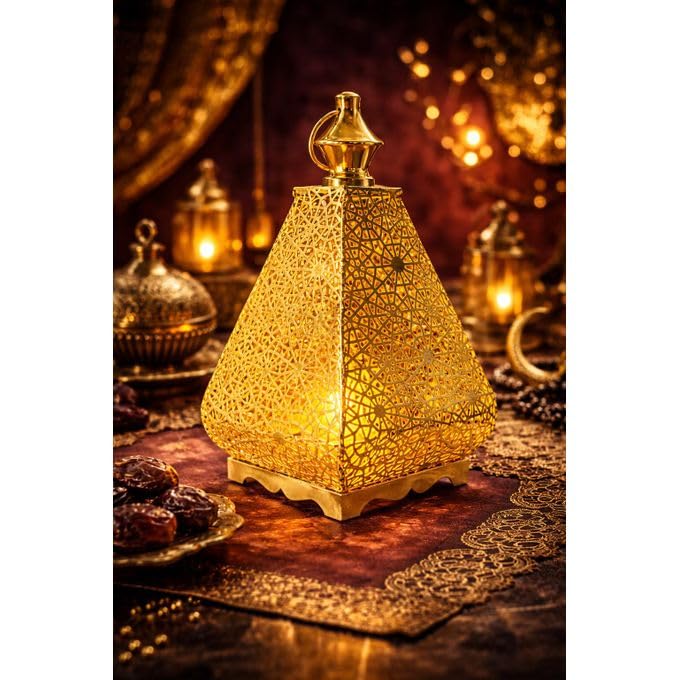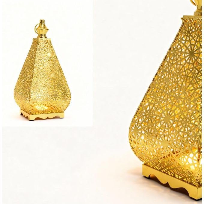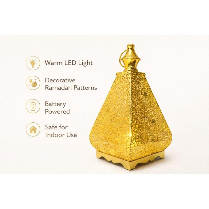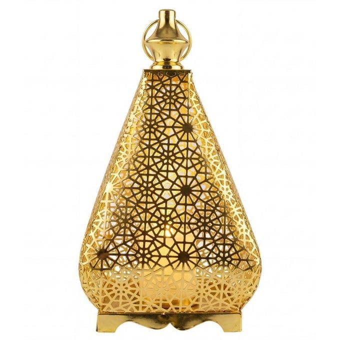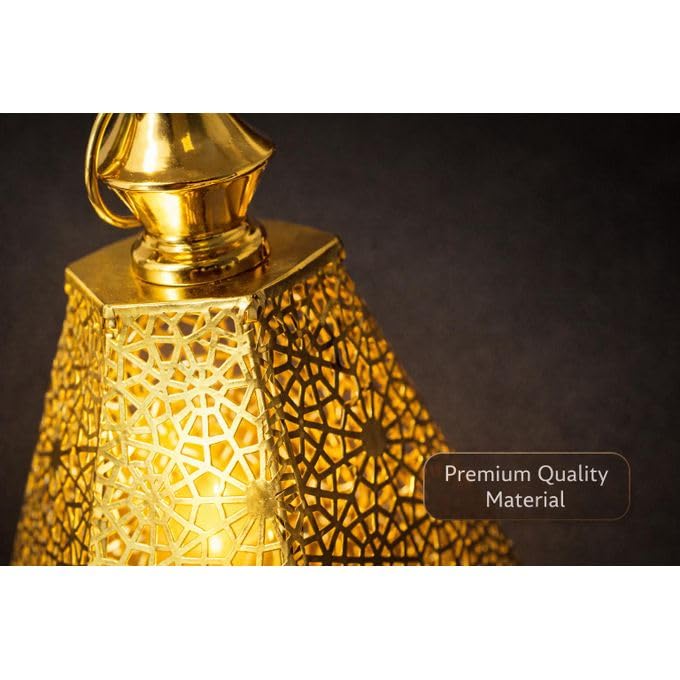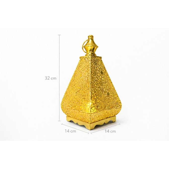 Generic - فانوس رمضان LED معدني بتصميم أرابيسك إسلامي هرمي، إضاءة دافئة، يعمل بالبطارية، ذهبي، 32x14x14 سم