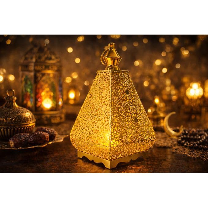 - تصميم أرابيسك إسلامي: فانوس رمضان بتصميم هرمي أنيق مع نقوش أرابيسك إسلامية تقليدية باللون الذهبي تضفي لمسة فخمة وروحانية على ديكور منزلك