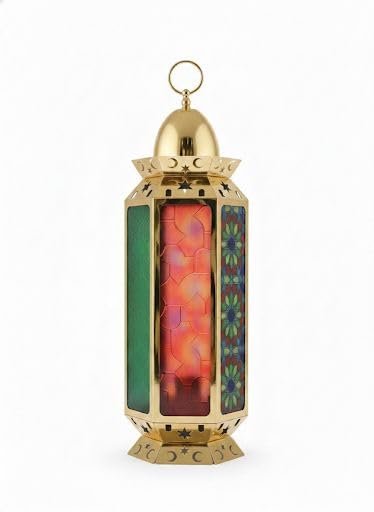 • تصميم تقليدي أنيق: فانوس رمضان بتصميم معدني مزخرف باللون الذهبي مع نقوش إسلامية دقيقة تعكس جمال الفن العربي الأصيل