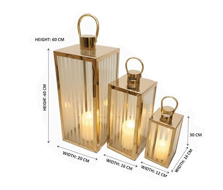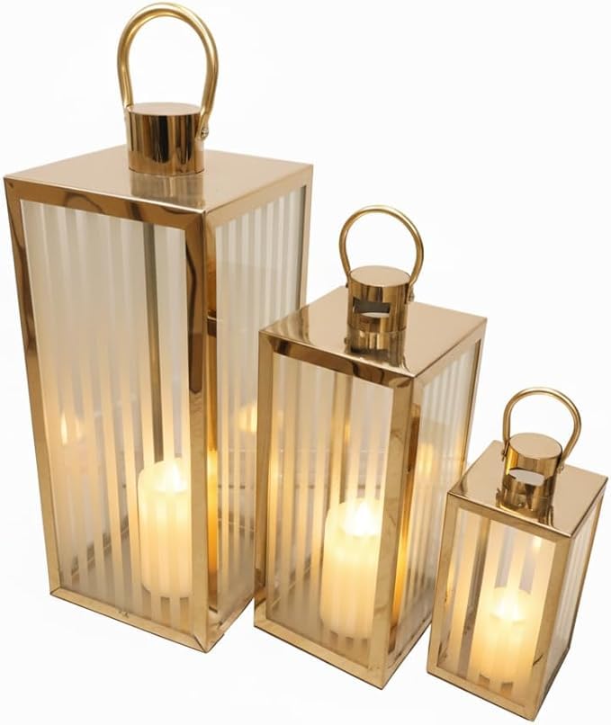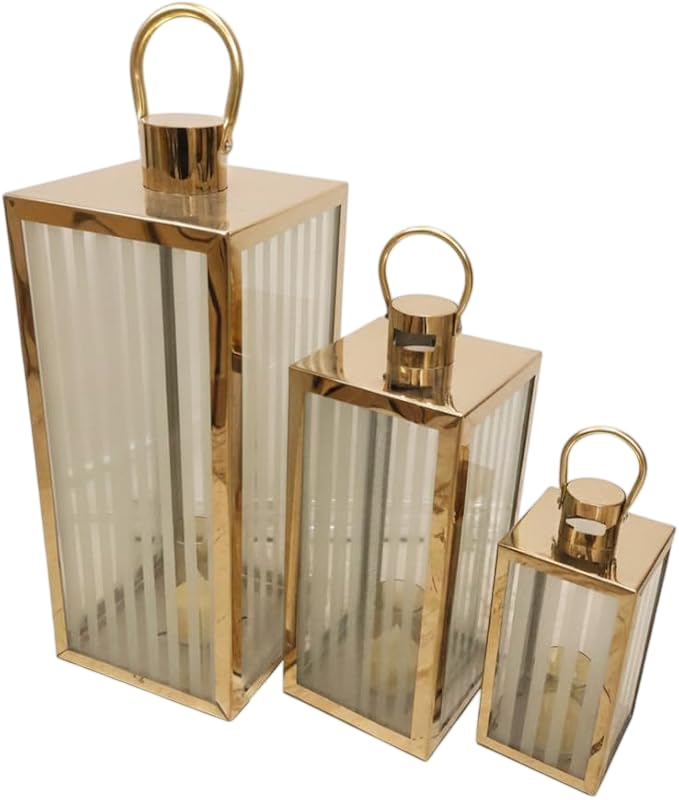 Generic - Ramadan Lanterns Set of 3 Pieces With A High-End Design Combines Shiny Golden Metal And Glass Striped With Soft Vertical Lines