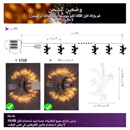 - استخدامات متعددة - سواء كنت تستضيف حفل إفطار أو تزين منزلك استعدادًا للعيد أو تبحث ببساطة عن تفتيح منزلك خلال شهر رمضان، فإن هذه الأضواء مثالية للاستخدام الداخلي والخارجي.