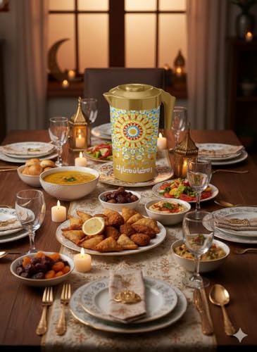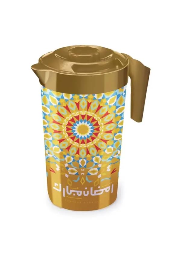 - تصميم مستوحى من شهر رمضان: يتميز بإبريق ذهبي أنيق مزين بأنماط زينة رمضان التقليدية، مثالي للتجمعات الاحتفالية والاستخدام اليومي خلال الشهر الكريم
