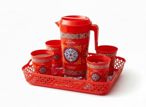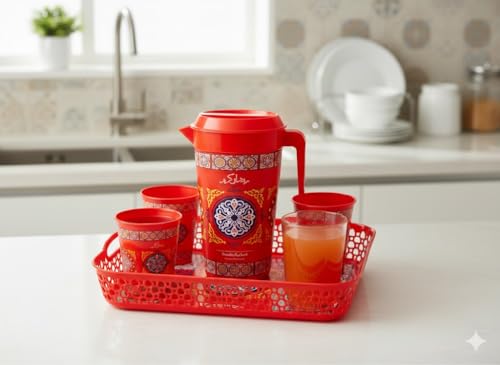 Generic - Ramadan Plastic Serving Set with Tray and Jug 1700ml and 4 Cups Premium Plastic, Red, Traditional Islamic Patterns, 5 Pieces