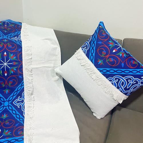 - DECORATIVE FRINGE DETAIL: Adorned with stylish white fringe trim on the edges, adding a sophisticated finishing touch that complements the colourful tile pattern