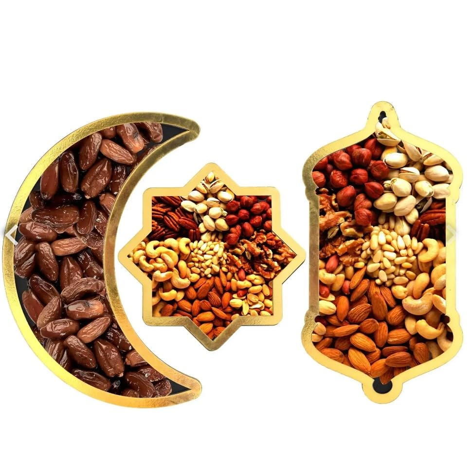 - Ramadani 3 Piece Serving Set: Includes Lantern Crescent Tray and Star for dates, nuts and goodies in a stylish way
