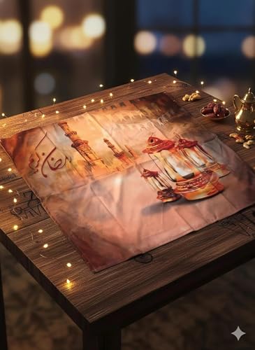 - مفرش طاولة رمضاني: مصنوع من القطيفة الفاخرة بنقشات ورسومات رمضانية مميزة تضفي أجواء روحانية على طاولتك خلال الشهر الكريم