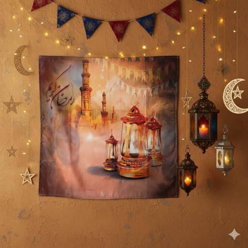 - تصميم فني متعدد الألوان: يتميز بكتابة عربية جميلة ورسومات رمضانية تقليدية بألوان دافئة تناسب الديكور الرمضاني