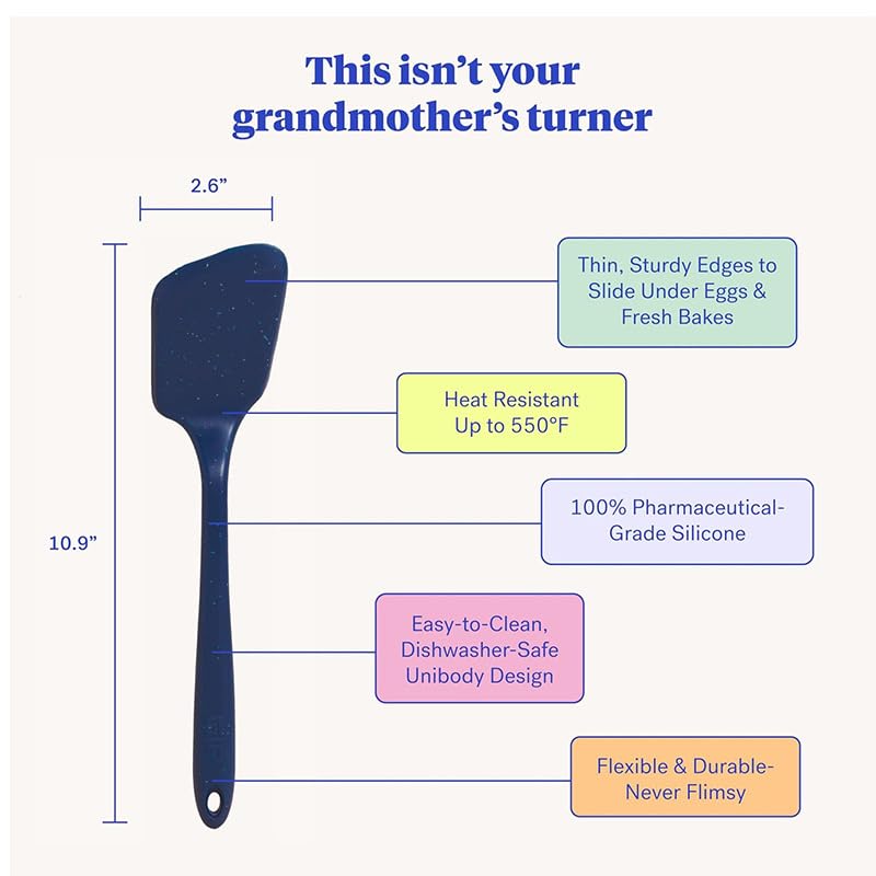 - Made of flexible, non-stick silicone with an angled face that easily slides under food without damaging it. Perfect for use with non-stick pots and pans and will not scratch or cause damage.