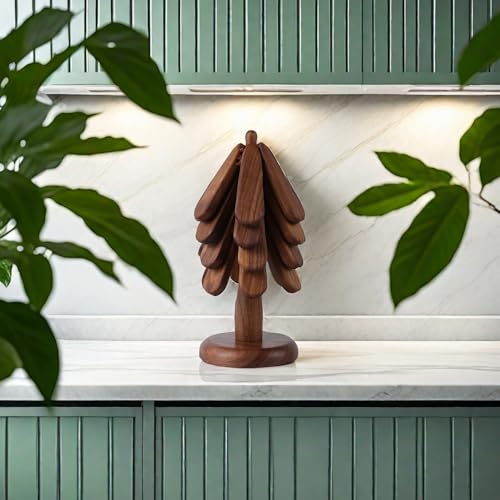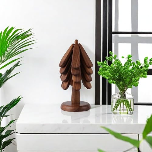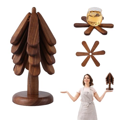RandJ - قواعد اكواب خشبية للشجرة، حوامل خشبية للاطباق الساخنة، مجموعة من 4 حوامل شجرة خشبية طبيعية قابلة للطي للمطبخ (خشب)