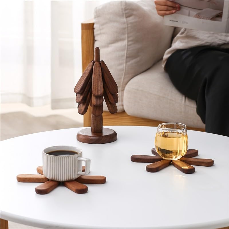 - قواعد أكواب خشبية للأشجار: حوامل للأطباق الساخنة مصنوعة من الخشب وتتكون من 4 قطع من الركائز + 1 دعامة لمنع تلف أسطح الطاولات وأسطح الطاولة.