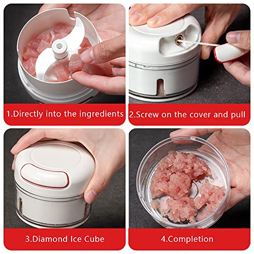 - 【Easy to Use】After install the blade, put the food into the lid, and then lock the transparent bowl, pull the sting 5-8 times, tap the chopper on the table, then all the food fall into the bowl. No electricity required.