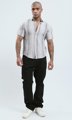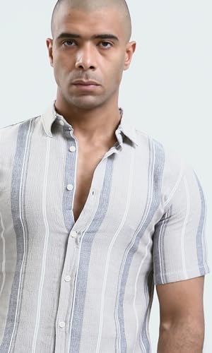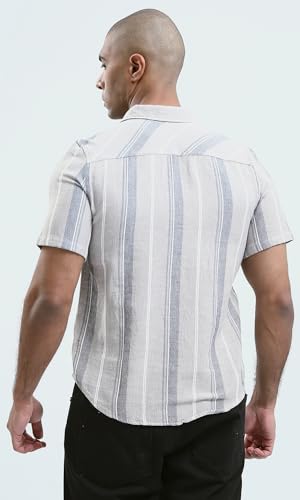Short Sleeves Striped Beige Buttoned Shirt