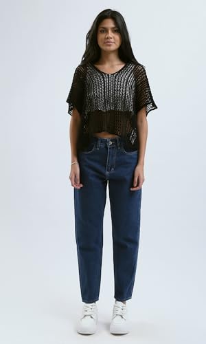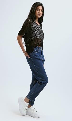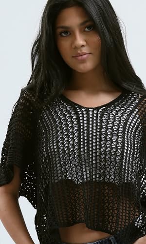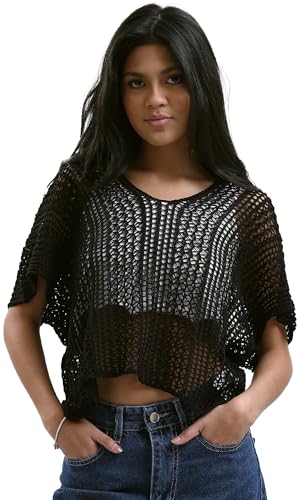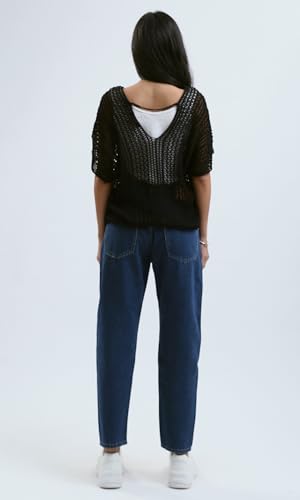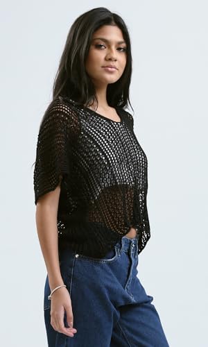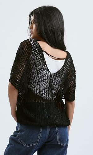 Ravin - Ravin Womens Black Loose Perforated Top with Wide V-Neck Modern