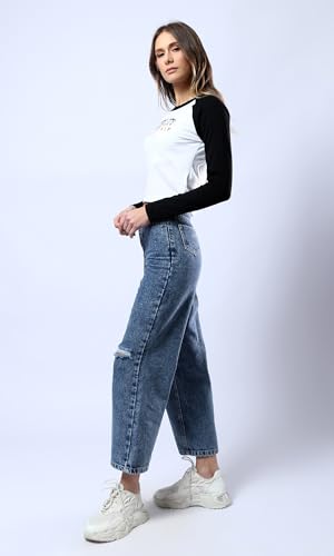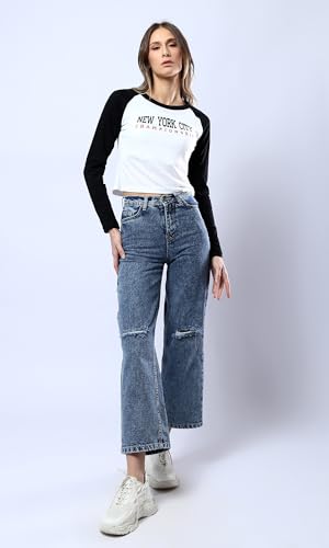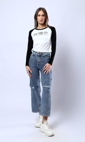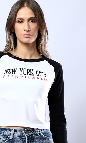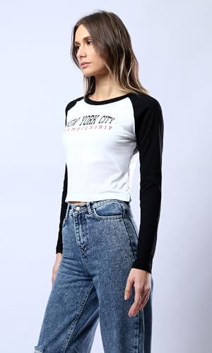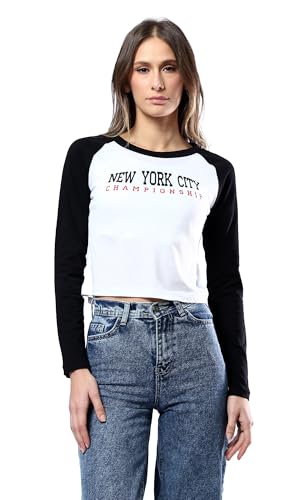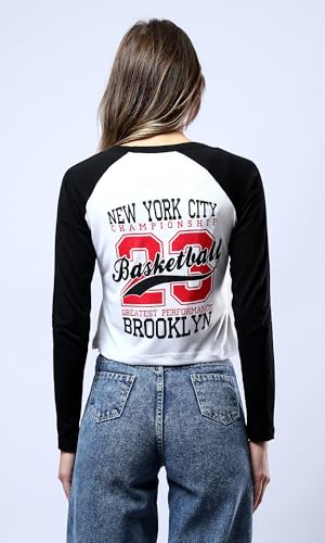 Ravin - Ravin Womens Crew Neck Printed Bi-Tone Short Tee - White & Black Modern