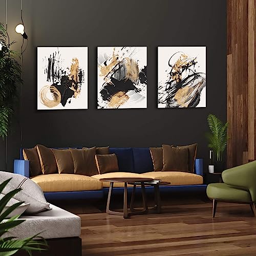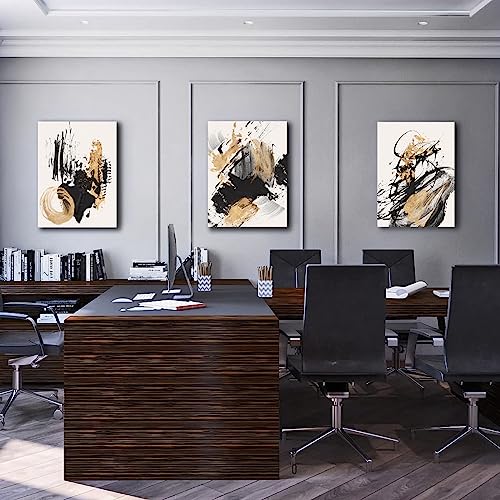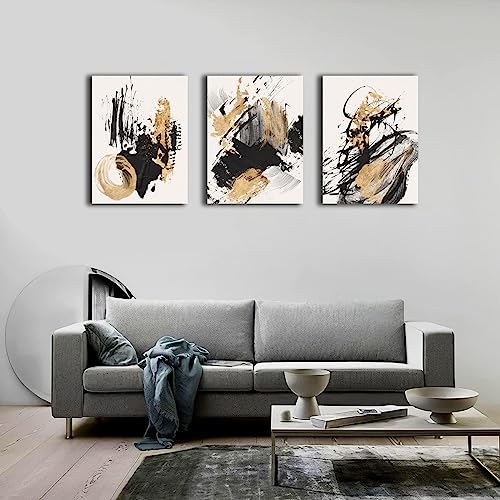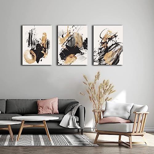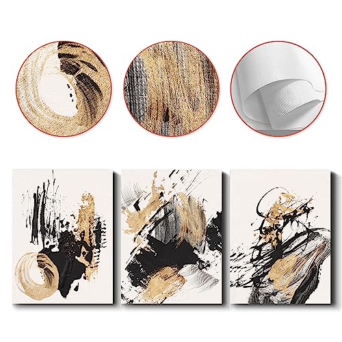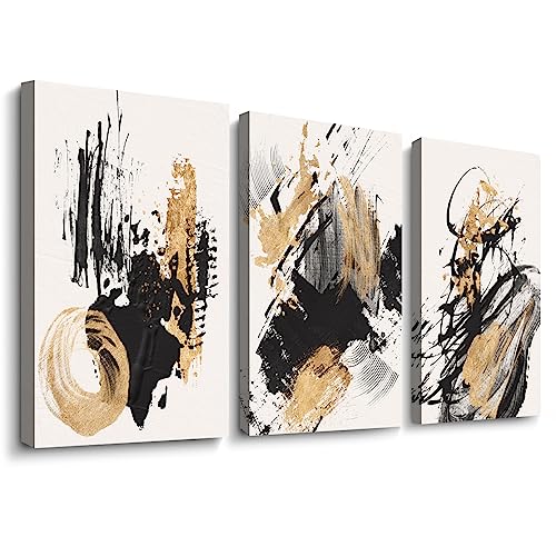 Sdmikeflax - Ready to Hang Canvas Wall Art, Gold and Black Ink Strokes Abstract Pattern Landscape Photography Printed on Canvas for Bedroom, Living Room, Office, Kitchen, Home Decor (ink,12x16 Inch, 3 Panels)
