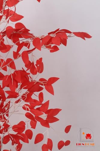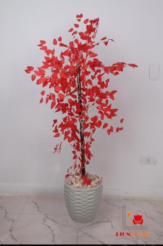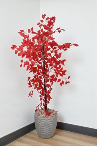 Lion Home - Realistic artificial tree - Leon Home artificial Benjamina plant, 145cm tall, for indoor and outdoor use, with a wooden trunk, plastic leaves, and decorative pebbles in a plastic pot - Red