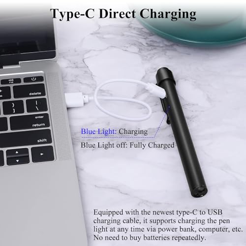 - 【تصميم قابل لإعادة الشحن】تم تصميم مصباح القلم هذا ببطارية مدمجة قابلة لإعادة الشحن. نحن مجهزون بأحدث كابل شحن من النوع C إلى USB ويمكنك شحن مصباح القلم في أي وقت عبر الباور بانك والكمبيوتر وما إلى ذلك. ستوفر أموالك لشراء البطاريات بشكل متكرر.