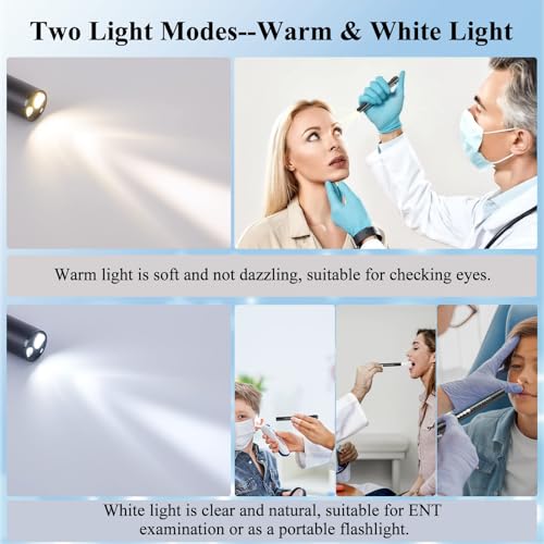 - 【وضعان للإضاءة】يمكن لمصباح القلم هذا التبديل بين أوضاع الضوء الأبيض والضوء الدافئ وفقًا لاحتياجاتك. الضوء الأبيض مناسب لفحص الأنف والفم والأذنين أو كمصباح يدوي للإضاءة، الضوء الدافئ مناسب لفحص العينين